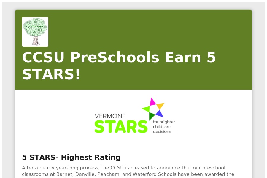CCSU PreSchools Earn 5 STARS! 5 STARS- Highest Rating After a nearly year-long process, the CCSU is pleased to announce that our preschool classrooms at Barnet, Danville,. . .